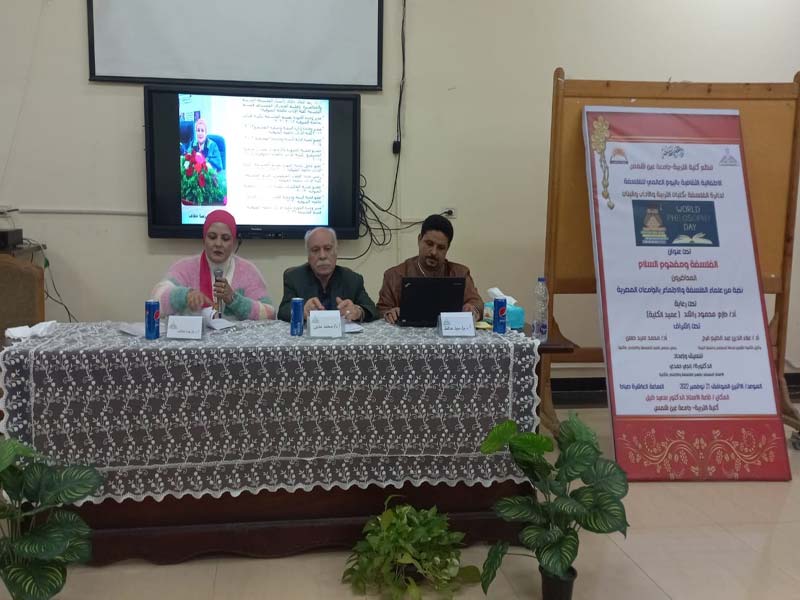 Under the auspices of Prof. Dr. Hazem Rashed, Dean of the Faculty of Education, and Prof. Dr. Alaa El Din Abdel Halim Mohamed Farag, Vice Dean for Community Service and Environmental Development, and chaired by Prof. Dr. Mohamed Sayed Hassan, Chairman of the Department Council, and coordinated and organized by Dr. Engy Hamdy, assistant professor in the department, and prepared by Dr. Fatima Bakr, a teacher in the department, the Department of Philosophy and Sociology at the Faculty organized a celebration of the International Day of Philosophy entitled "Philosophy and the Concept of Peace and Peaceful Coexistence" within the Department of Philosophy in the Faculties of Education, Arts and Girls at the university.