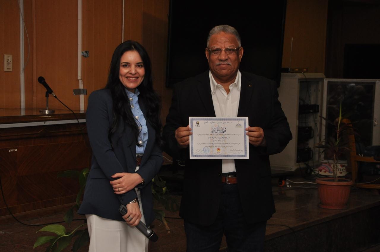 This was followed by a presentation of distinguished graduates of the Spanish Language Department in various fields of work. The presentation included diplomats from the Egyptian Ministry of Foreign Affairs, tourism experts, radio broadcasters, television channel editorial directors, officials from the Ministry of Education, translators, and officials from communications technology companies, where they were honored and presented with certificates of thanks and appreciation. To them for their outstanding performance during their professional career.