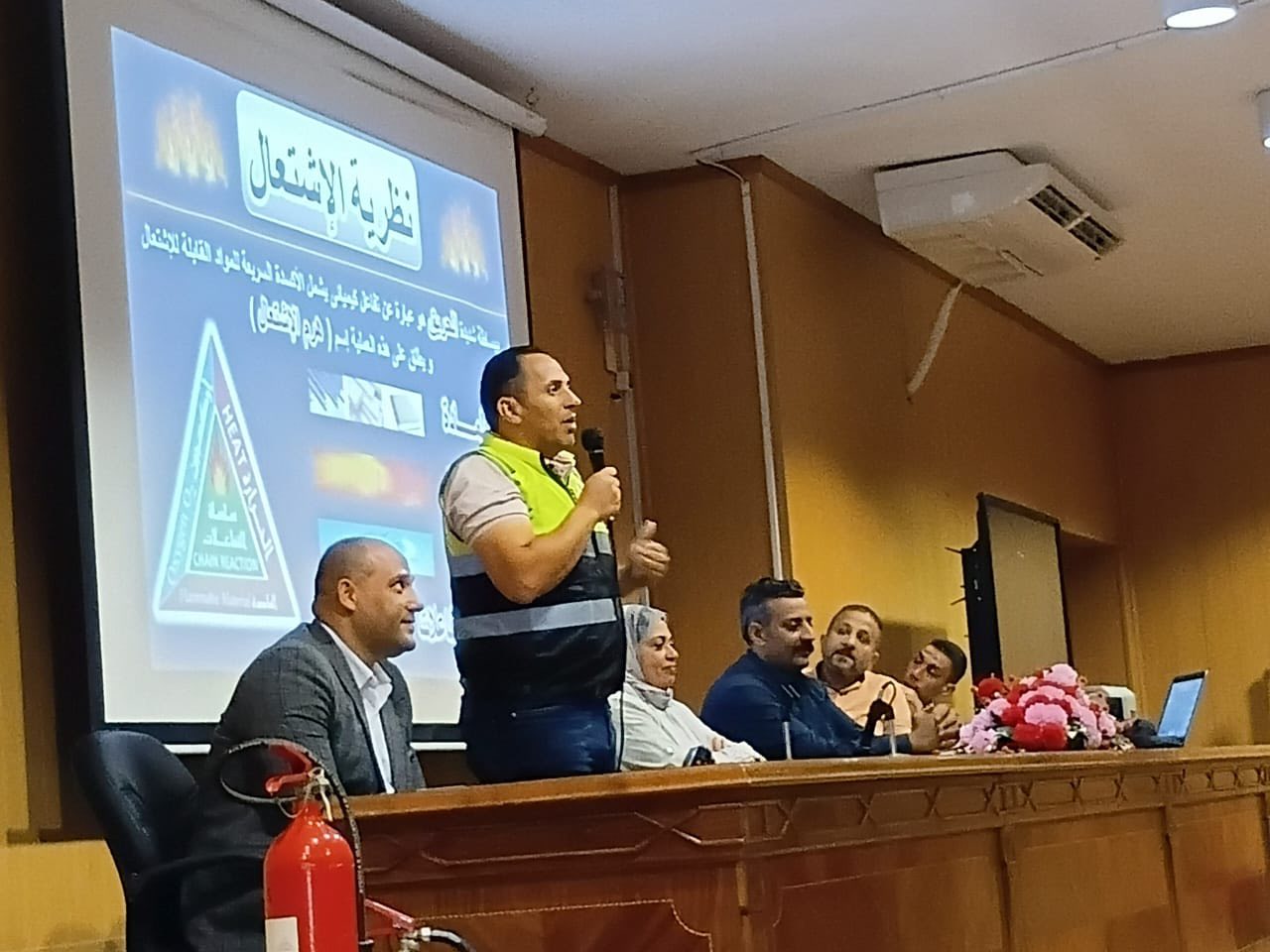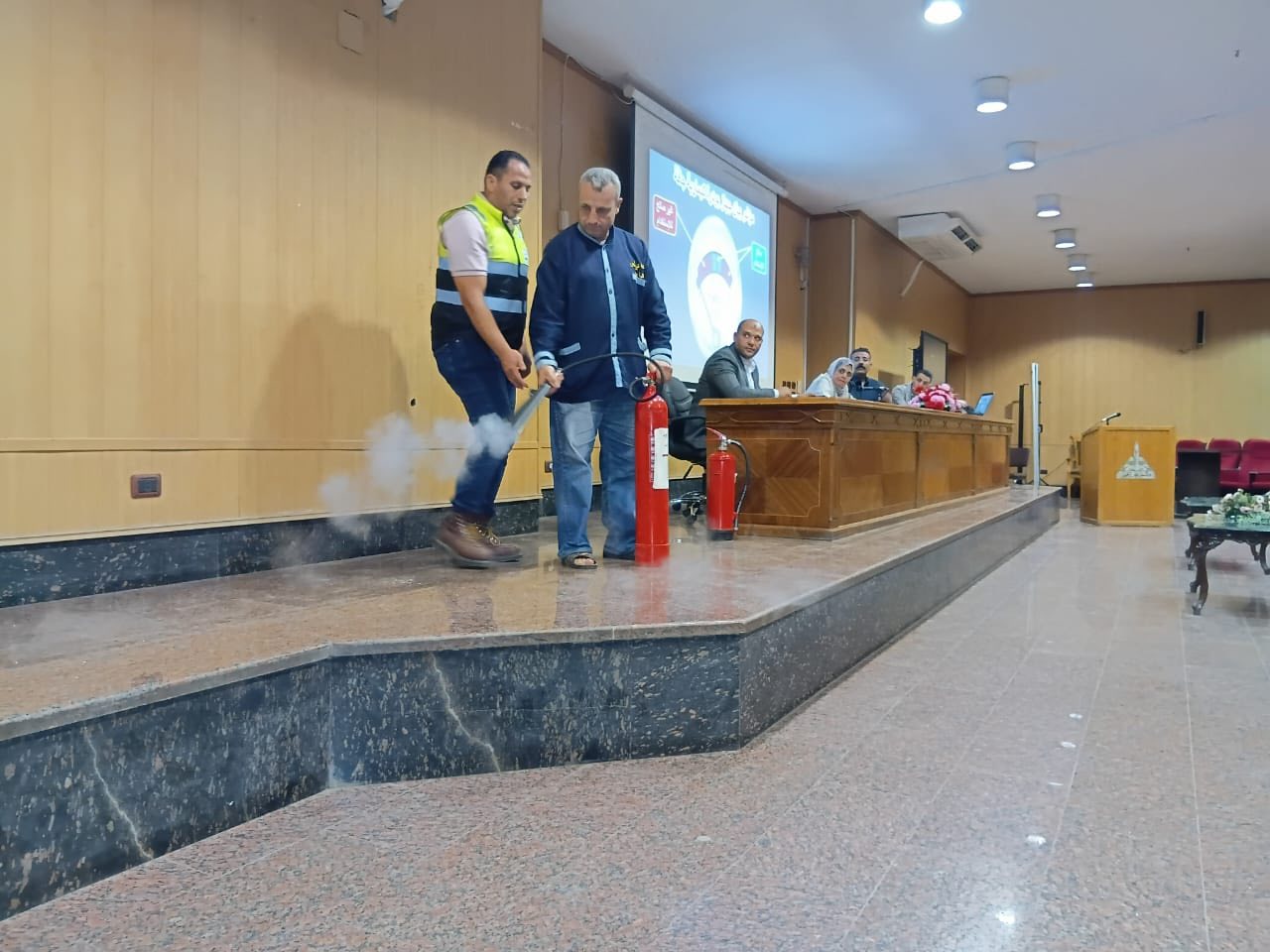 Mr. Samir Farouk Hassan presented a detailed explanation of different fire extinguishing devices, their components, and mechanisms, noting that Ain Shams University is among the first Egyptian universities to establish a fully integrated Civil Defense Department equipped with advanced human and technical resources. This department operates within a comprehensive crisis management system aimed at safeguarding lives and property.