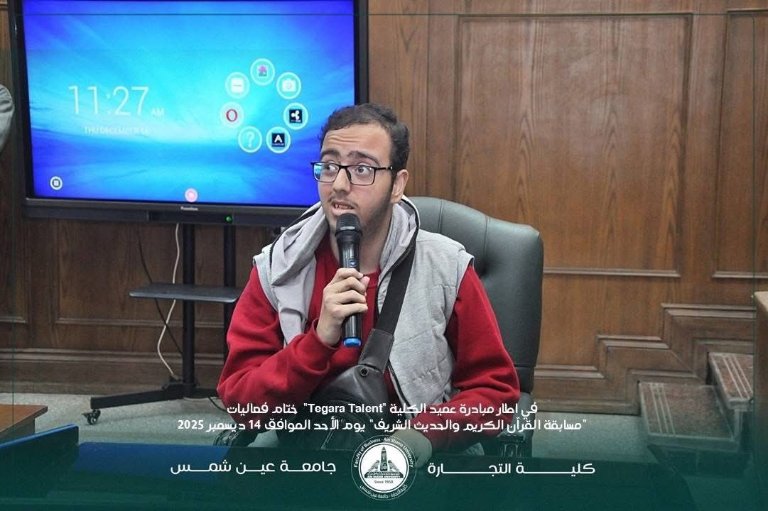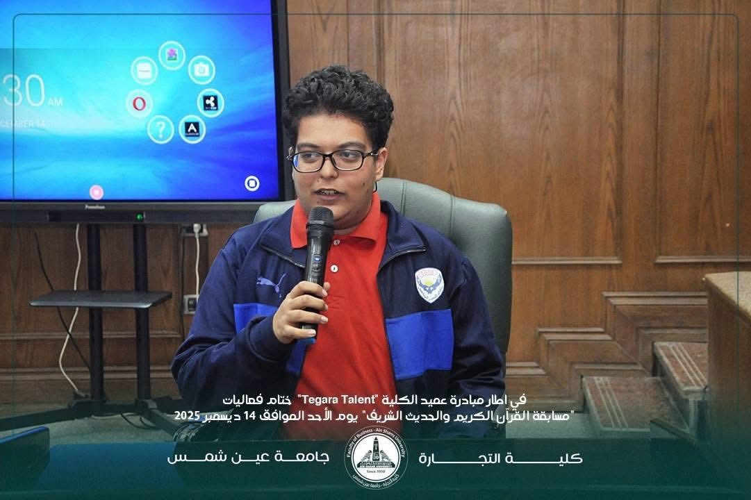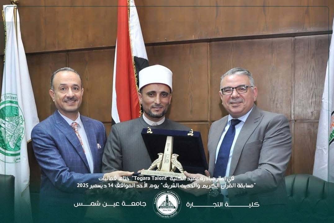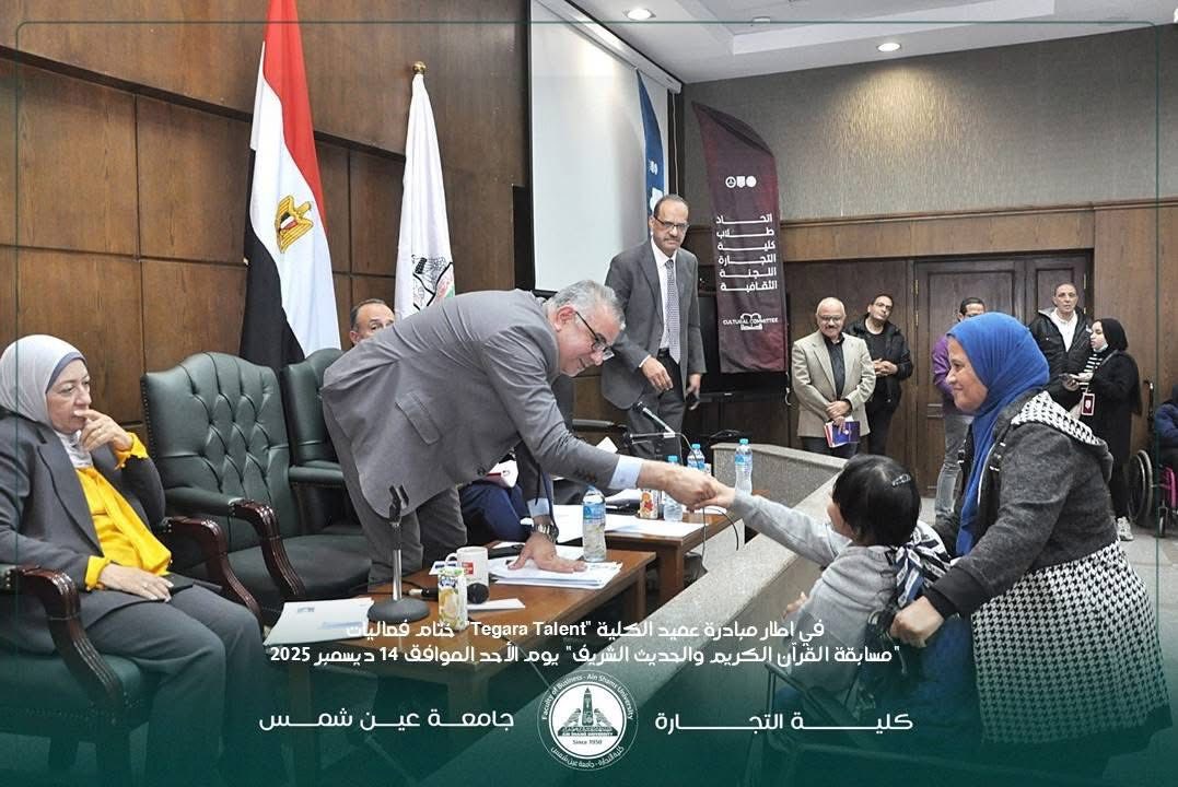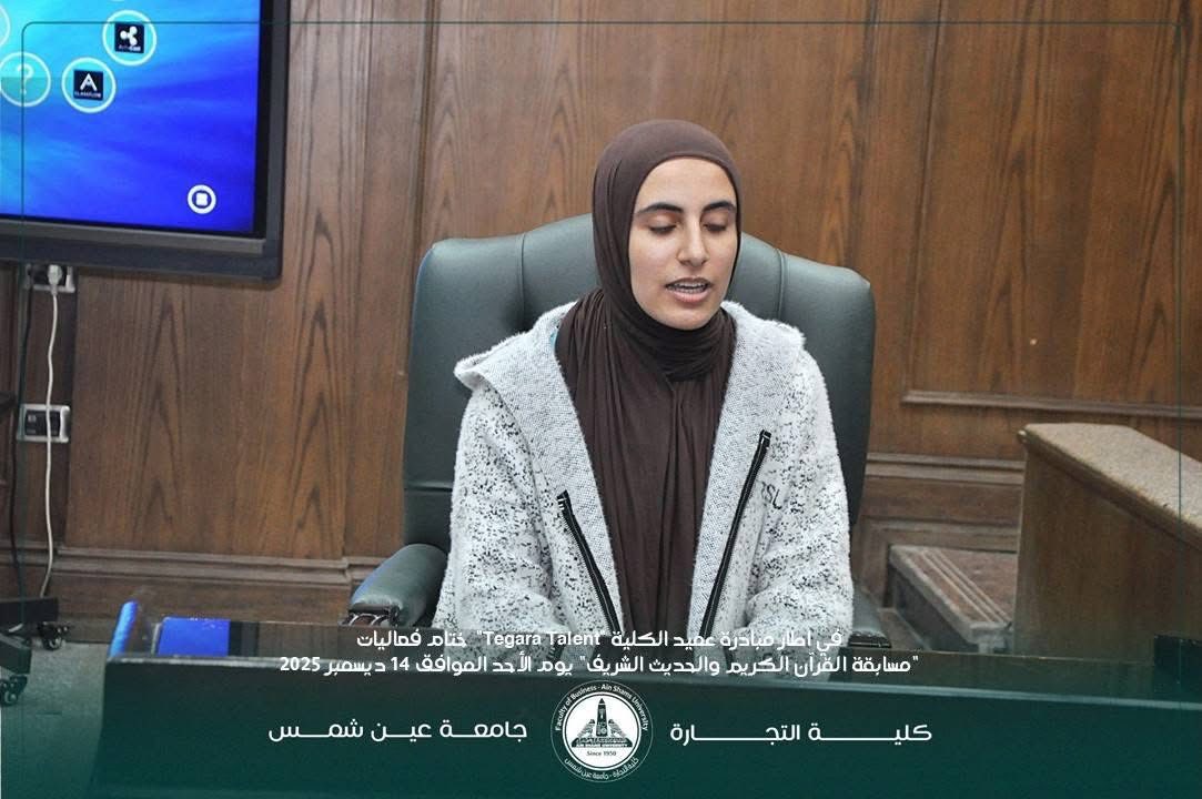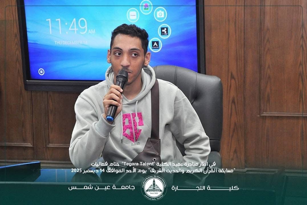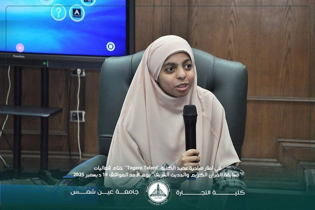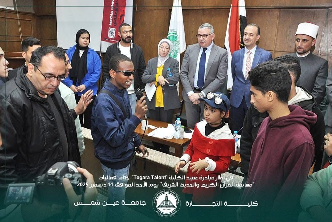 Held under the patronage of Prof. Mohamed Diaa Zain El-Abedeen, President of Ain Shams University, and attended and sponsored by Prof. Farid Moharram El-Garhy, Dean of the Faculty, the Faculty of Business concluded the activities of the Holy Qur’an Competition (memorization, recitation, and Tajweed) on Sunday, December 14, 2025. The competition was organized within the framework of the pioneering “Business Talent” initiative, launched by the Dean to provide an accredited platform for discovering and nurturing students’ talents across various fields within a supportive and competitive environment.