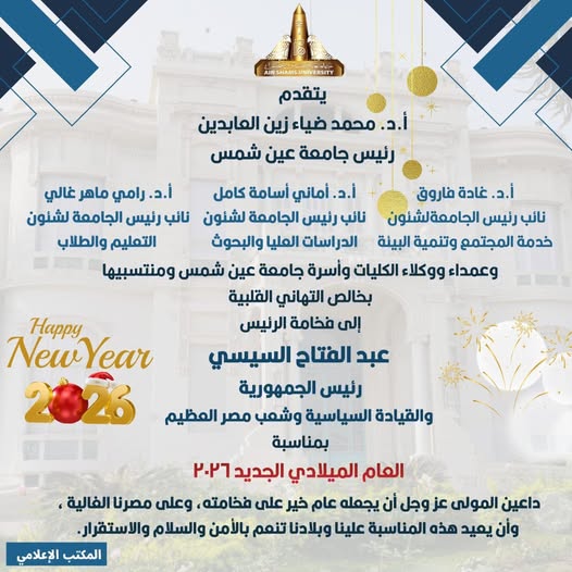 Prof. Mohamed Diaa Zain El Abedeen, President of Ain Shams University, Prof. Ghada Farouk, Vice President for Community Service and Environmental Development, Prof. Amany Osama Kamel, Vice President for Graduate Studies and Research, Prof. Rami Maher Ghali, Vice President for Education and Student Affairs, the Deans and Vice Deans of the Faculties, and the entire Ain Shams University community extend their heartfelt congratulations to His Excellency President Abdel Fattah El-Sisi, the political leadership, and the great people of Egypt on the occasion of the New Year 2026. They pray to God Almighty that it will be a year of prosperity for His Excellency and for our beloved Egypt, and that this occasion will return to us and our country with security, peace, and stability.