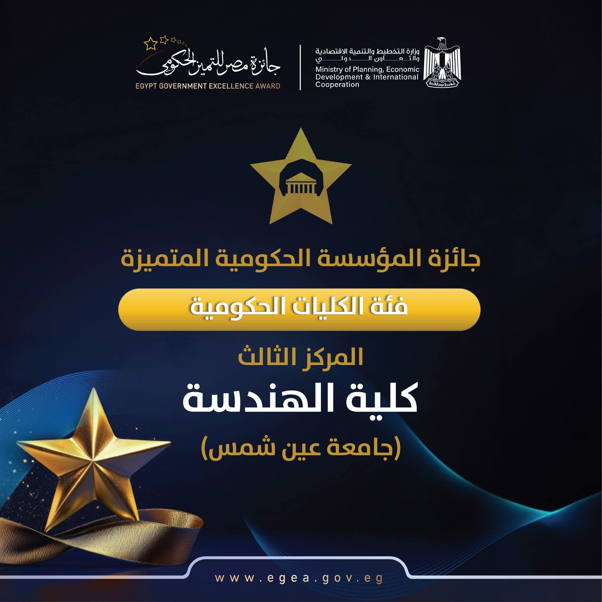 In a new achievement added to Ain Shams University's record of excellence, the Faculty of Engineering at Ain Shams University won third place in the Egypt Government Excellence Award in the Faculties category (Institutional Excellence). This occurred during the fourth edition of the award, held under the patronage of His Excellency President Abdel Fattah El-Sisi and in the presence of the Prime Minister.