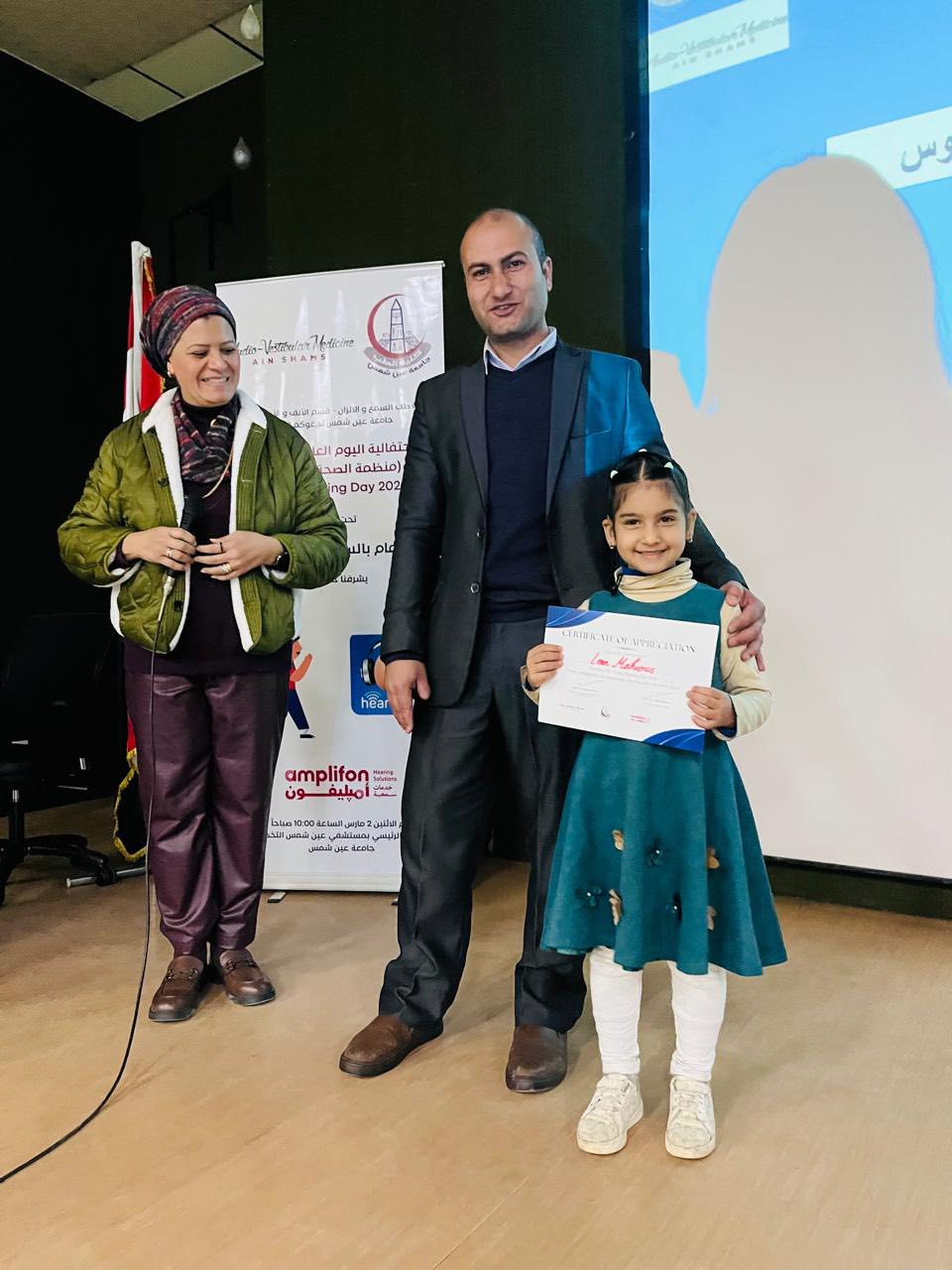 The event was attended by Prof. Tarek Youssef, Executive Director of Ain Shams University Hospitals; Prof. Hala Suweed, Vice Dean of the Faculty of Medicine for Community Service and Environmental Development; Prof. Hesham Anwar, Director of Ain Shams University Specialized Hospital; and Prof. Hesham Taha, Head of the Audiology and Balance Unit, in addition to Prof. Nadia Kamal, the event coordinator, and Prof. Dalia Hassan, the event organizer.