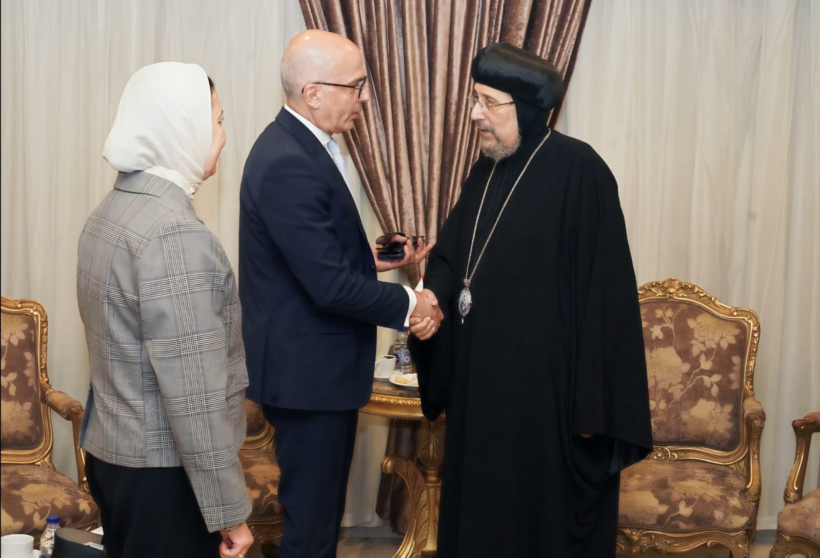 Prof. Mohamed Diaa Zain El-Abedeen, President of Ain Shams University; Prof. Amany Osama Kamel, Vice President for Graduate Studies and Research; and Prof. Rami Maher Ghali, Vice President for Education and Student Affairs, paid an official visit to the Coptic Orthodox Cultural Center to extend their congratulations to His Grace Anba Ermia, General Bishop and Head of the Coptic Orthodox Cultural Center, on the occasion of the Glorious Easter celebration.