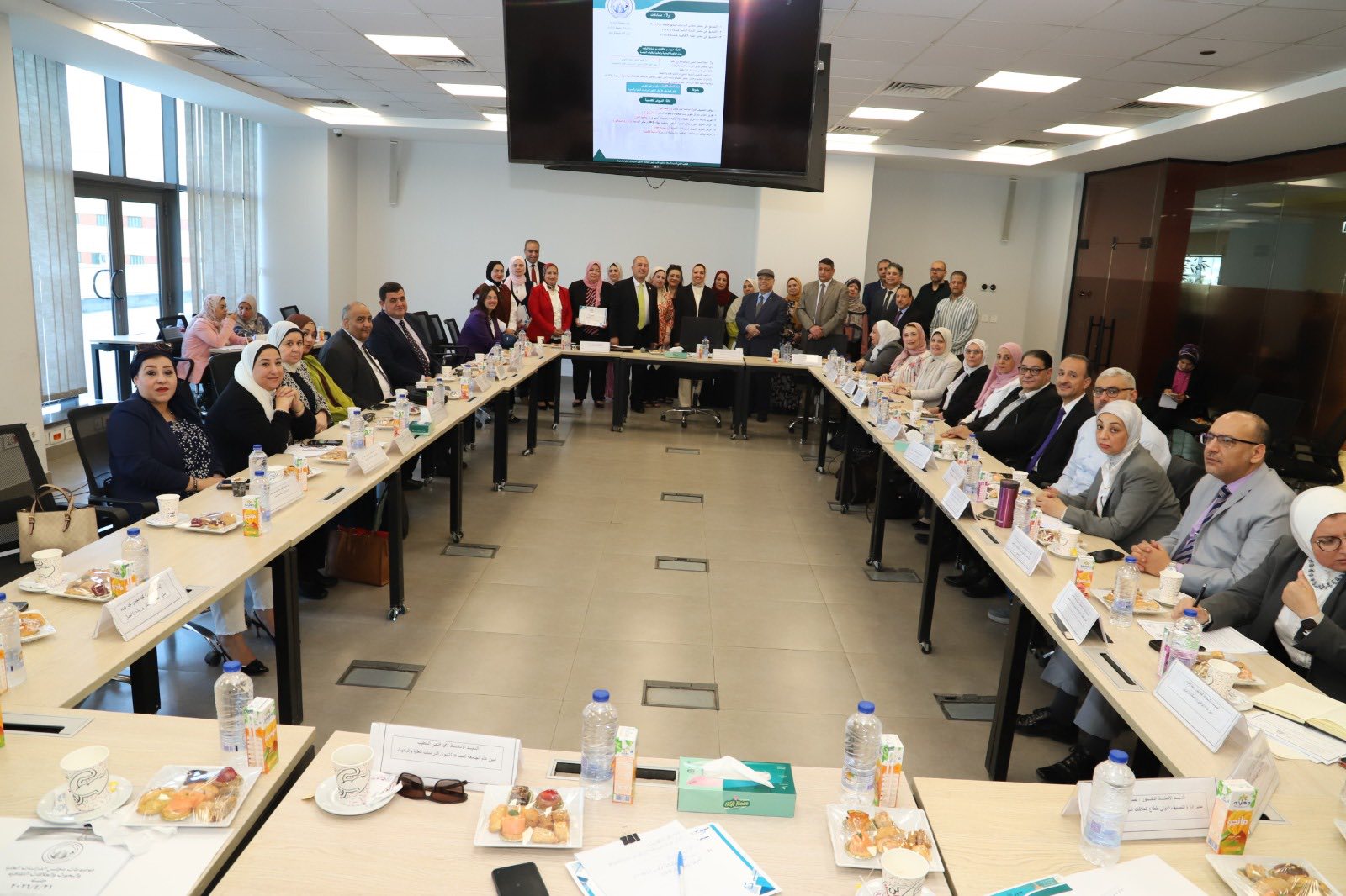 At the conclusion of the meeting, Dr. Dina Lashin, Director of the International Students Office, presented a proposed model for developing a survey to measure international student satisfaction, in collaboration with the Quality Assurance and Accreditation Center. She also presented a comprehensive plan for short-term training programs, including mechanisms for announcement and application, data collection, obtaining necessary approvals, and marketing the programs across various platforms. Furthermore, she reviewed the colleges' proposals in this regard.