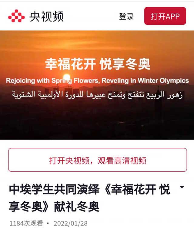 كتب الموقع الرسمي لشبكة التلفزيون الصيني المركزي الإخبارية أن فعاليات أولمبياد بكين الشتوية ستبدأ خلال أيام، ولقد قام طلاب جامعة عين شمس بالتعاون مع طلاب أكاديمية نانجين الصينية للفنون باستخدام طريقتهم الخاصة لدعم أولمبياد بكين الشتوية، حيث قام الطلاب بالاشتراك في غناء " تتفتح زهور السعادة وتمنح عبيرها للأولمبياد الشتوية " المكونة من 3 أغاني باللغات العربية والصينية والانجليزية، وهذا يدل على عمق العلاقات وقوة التعاون بين البلدين في المجالات المختلفة.