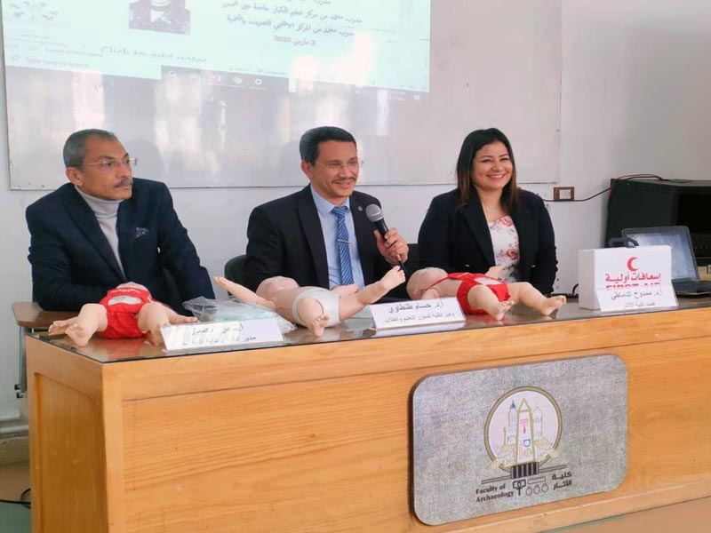 أوضح أ. د. ممدوح الدماطي عميد الكلية، بأن هذه الفاعلية تأتي في إطار ما تشهده كلية الآثار من تطوير وتنفيذ لبرامج تدريبية تتضمن محاضرات وورش عمل تهدف إلى تنمية مهارات طلاب المرحلة الأولي واكسابهم خبرات حياتية، وتزويدهم بالإرشادات والنصائح الواجب إجرائها فور تعرض أي شخص للإصابات المختلفة، كذلك كيفية التعامل مع الحالات الطبية الطارئة قبيل وصول المساعدات سواء من عربات الاسعاف أو نقل المصاب إلى مستشفى.