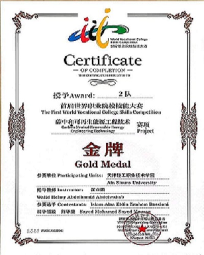 وبفضل الله وتوفيقه حصل الفريق الأول على الميدالية الذهبية في المسابقة وتم إرسال شهادة التكريم من الجانب الصيني لإدارة الكلية.