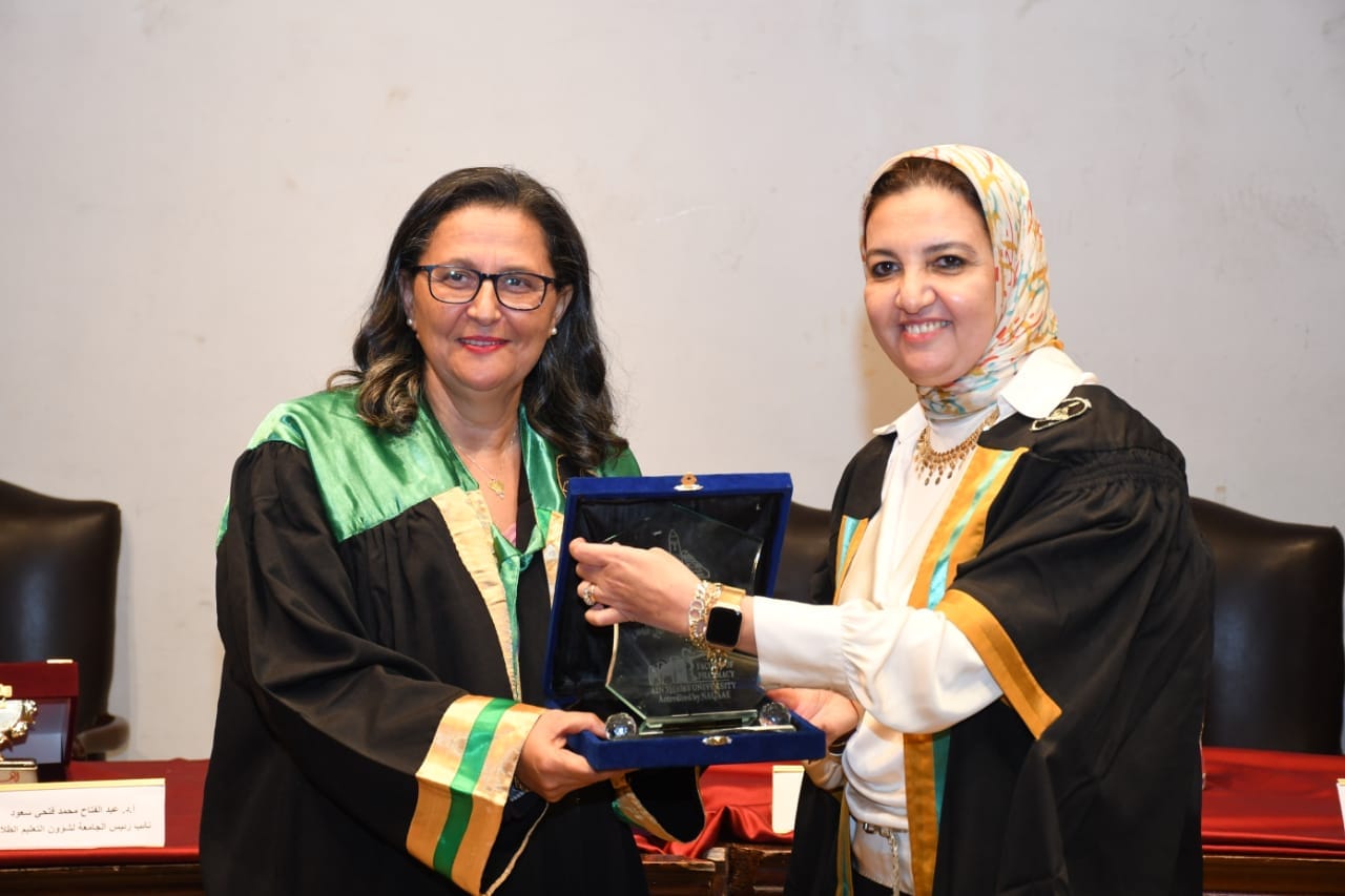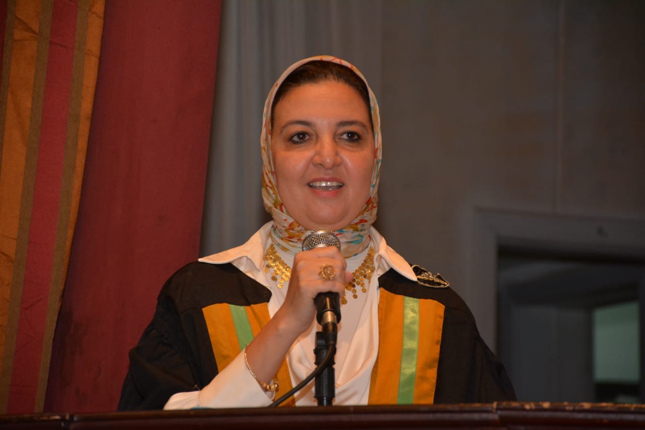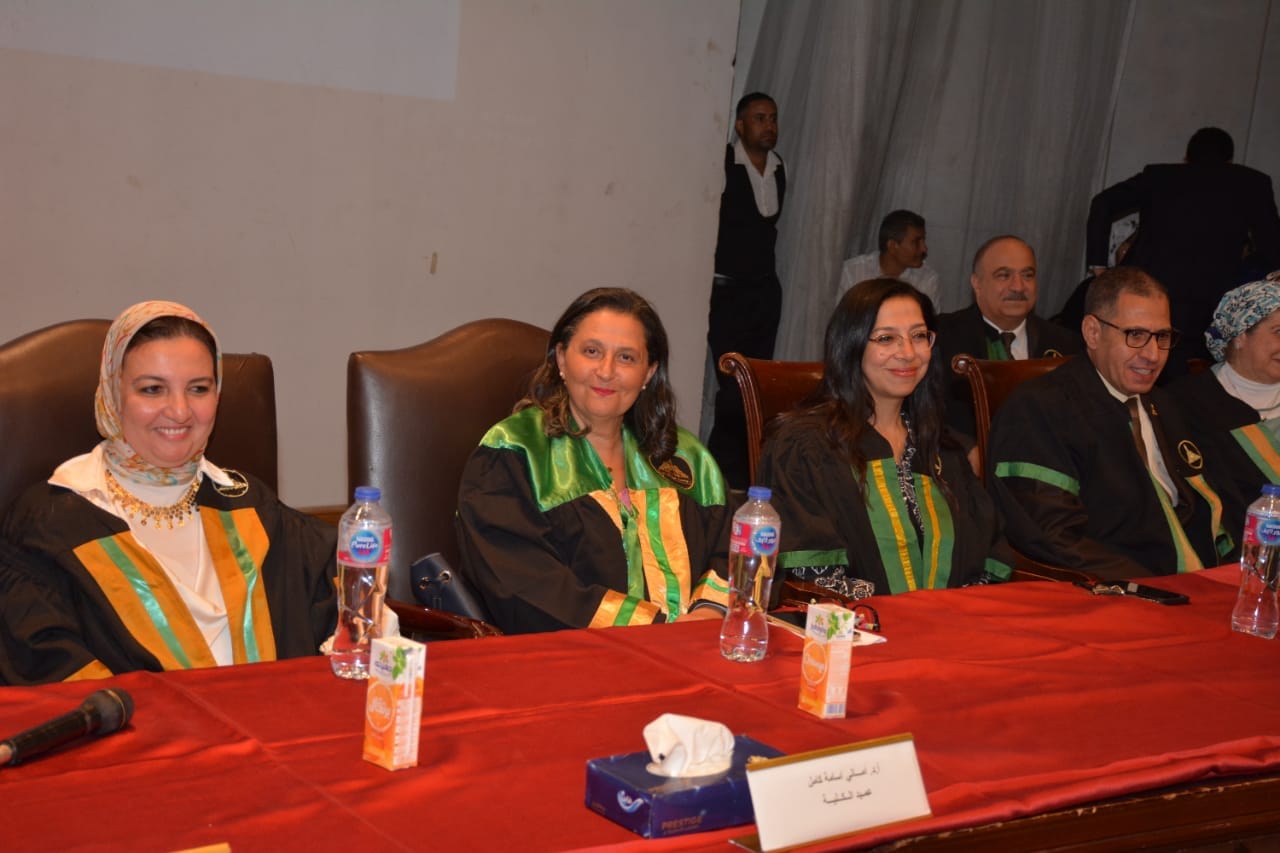 كما رحبت بالخريجين وما بذلوه من جهد وعمل دؤوب في الأنشطة الطلابية وخدمة المجتمع وفريق القوافل الطبية وجواهر البحث العلمي المشروعات التي قدمها الطلاب وتم نشرها بالدوريات الدولية Q1 وكان للدفعتين 2022/ 2023 الفضل في التعاون مع الكلية للحصول الكلية على الاعتماد الدولي من الهيئة الأمريكية للاعتماد والتوثيق الدولي، وتعد الكلية أول صيدلة حكومية تحصل على هذا الاعتماد.