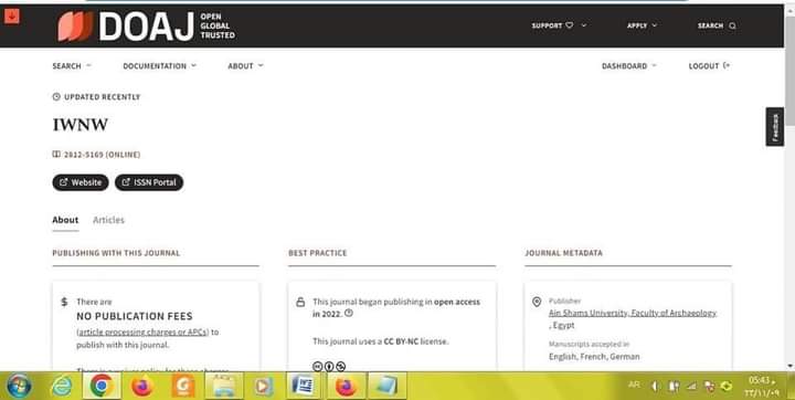 تحت رعاية أ. د. رئيس الجامعة محمد ضياء زين العابدين، و أ. د. نائب رئيس الجامعة لشئون الدراسات العليا والبحوث، وأ. د. حسام طنطاوي، عميد كلية الآثار وتحت إشراف أ.د. أحمد الشوكي، وكيل الكلية لشئون الدراسات العليا والبحوث، وأ. د. حسن سليم، رئيس تحرير المجلة، و د. شيماء أحمد، مدير التحرير، ومدير وحدة النشر العلمي، تم إدراج مجلة إيونو IWNW ضمن منصة الوصول الحر، دُواج DOAJ، Directory of Open Access Journals، والتي تُعد واحدة من أكبر منصات الوصول الحر في العالم والشرق الأوسط وأكثرها موثوقية، وتعتمد نظامًا للجودة أنشئ عام 2003 في جامعة لوند بالسويد.
