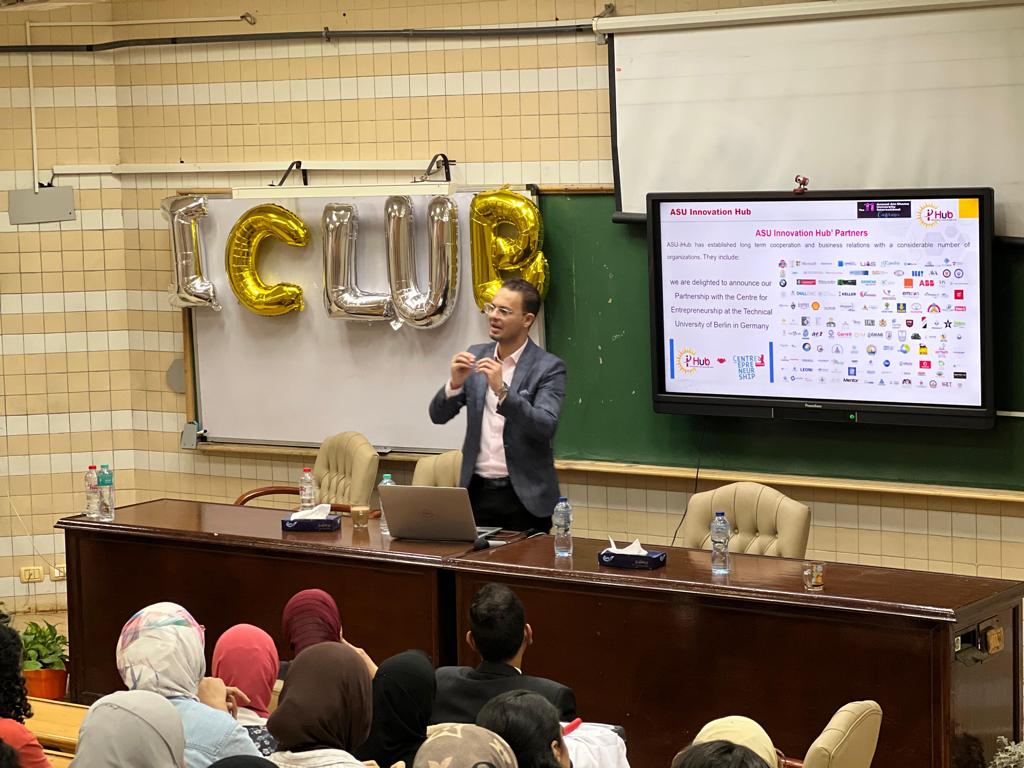 و قد حاضر بالندوة د إسلام عدلي مدير النشاط الطلابي بمركز الإبتكار وريادة الأعمال ASU-IHub ومدير مشروع نوادي الابتكار ASU-I Club حيث تم التعريف بنادي الابتكار الطلابي مع عرض نماذج من النجاحات التي ساهم فيها نادي الإبتكار لبعض الطلاب بجامعة عين شمس.