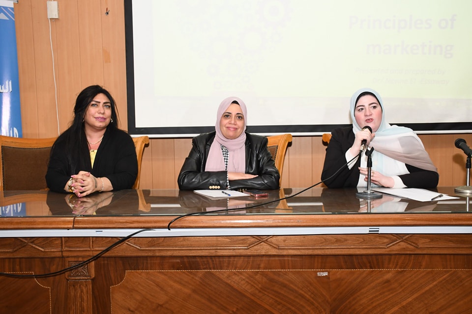 حاضرت في ورشة العمل الدكتورة نيفين العيسوي، وتناولت المفاهيم المختلفة للتسويق وتقسيم الأسواق واستهداف الشرائح ومراحل وخطوات التسويق والمزيج التسويقي المتطور وصناعة الميزات التنافسية والحملات الإعلانية واعداد الخطة التسويقية الناجحة للمشروعات الصغيرة.