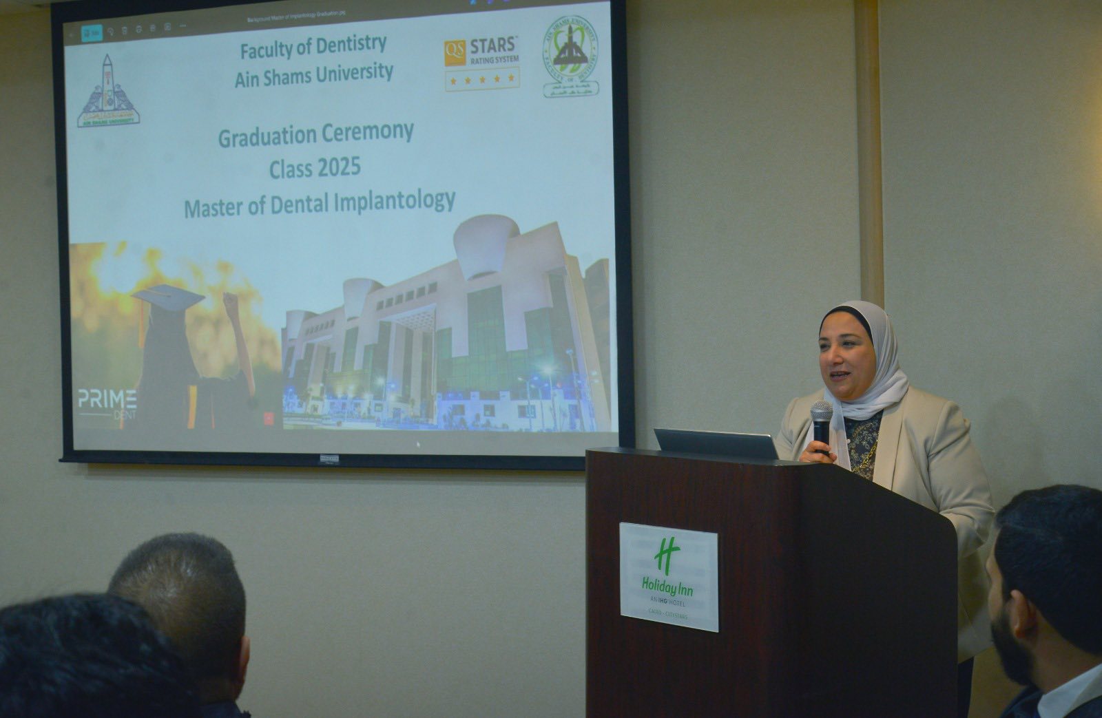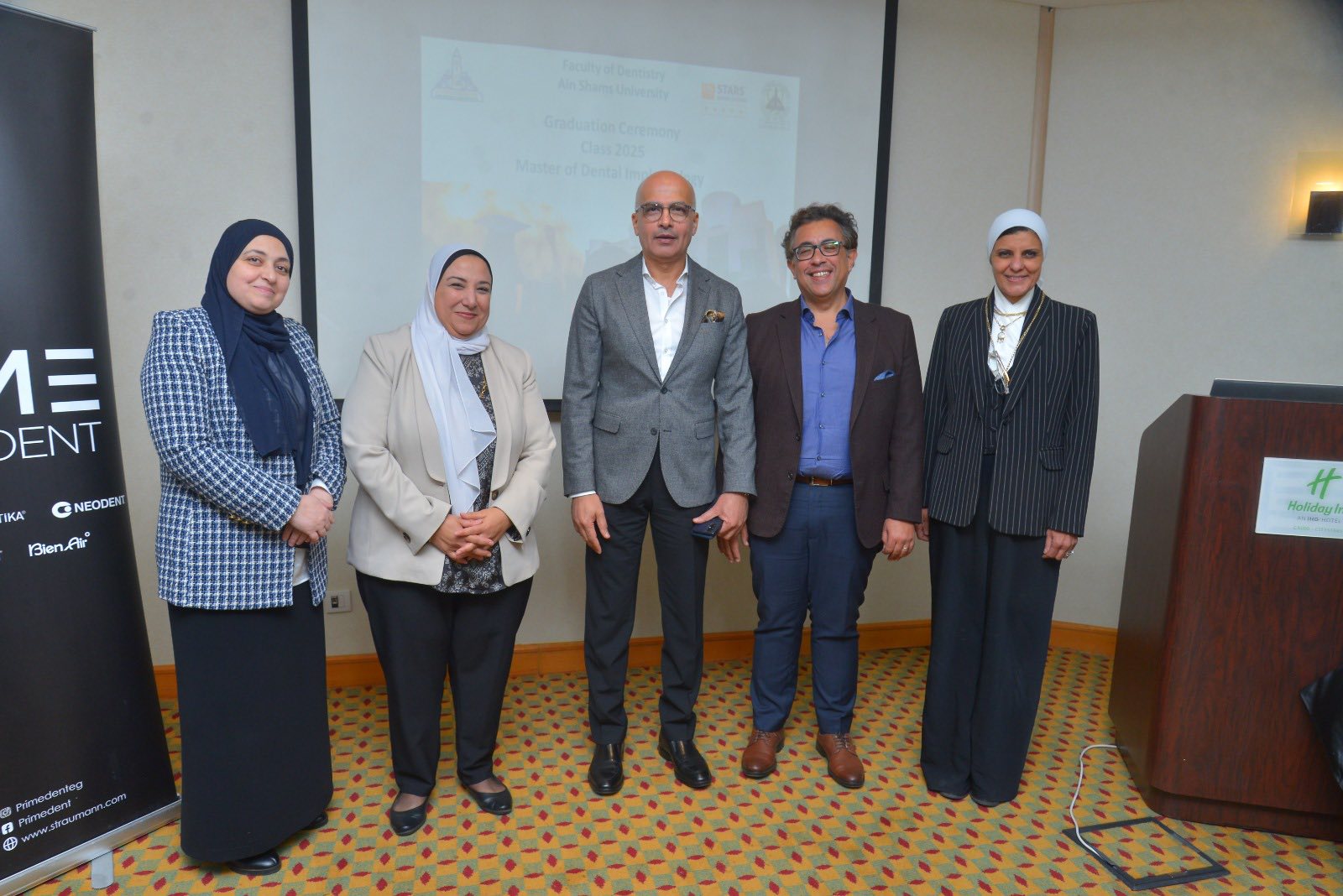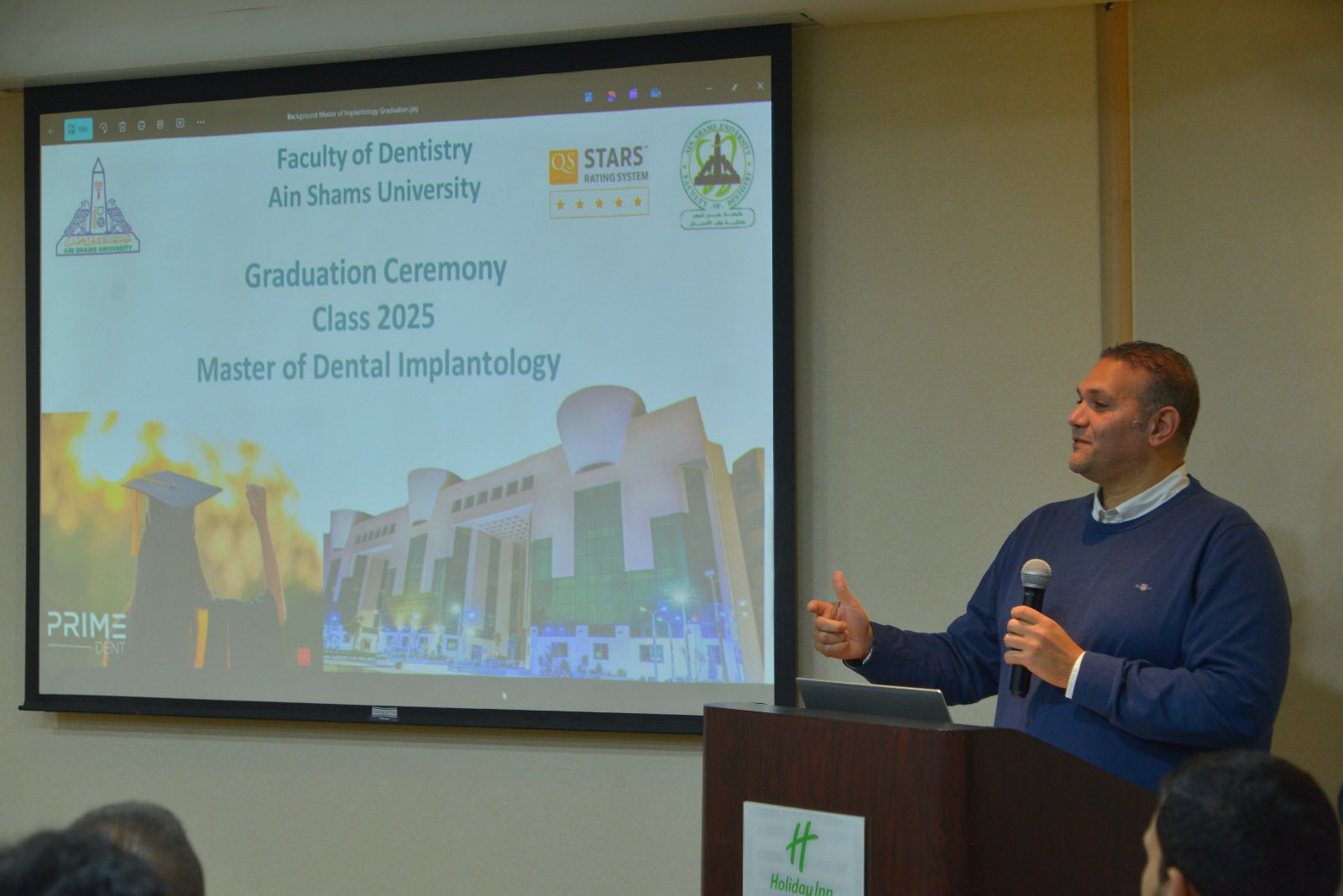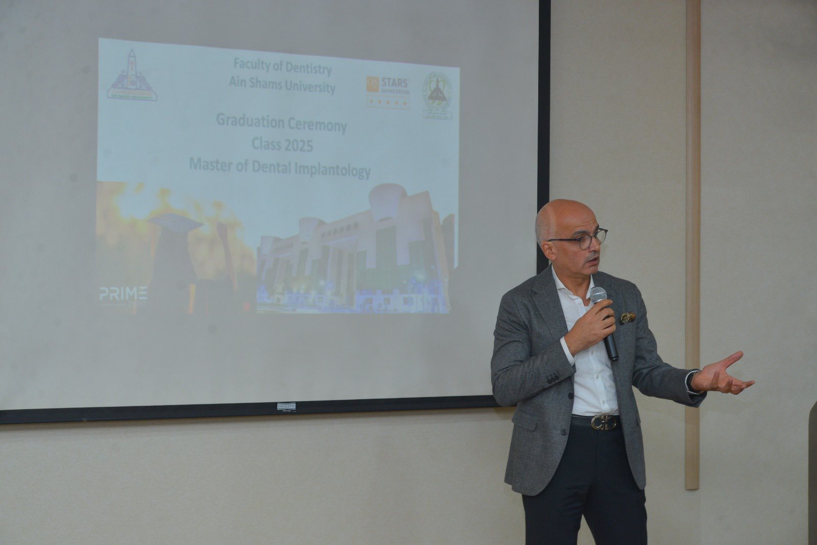 وفي كلمته أعرب الأستاذ الدكتور محمد ضياء زين العابدين عن تقديره الكبير للجهود المبذولة في إعداد وتطوير برنامج ماجستير غرسات الأسنان، موجّهًا الشكر إلى القائمين على التدريس بالبرنامج من مختلف الأقسام، ومؤكدًا اعتزازه بالخريجين وما حققوه من إنجاز، مشددًا على أهمية استكمال مسيرة التطوير والبناء التي أرستها الإدارات السابقة.