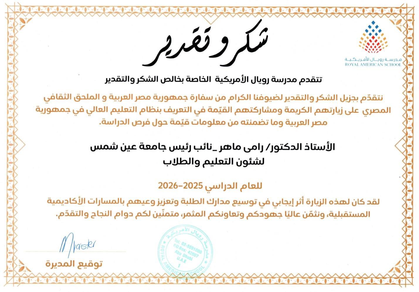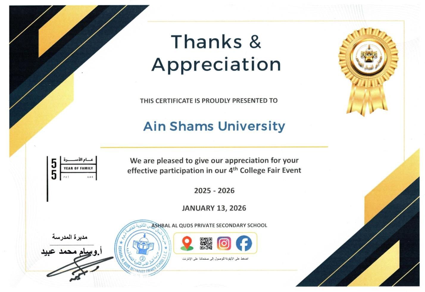 وقد تم تكريم جامعة عين شمس على مشاركتها الفعالة في الملتقى وتسلم شهادة التكريم الأستاذ الدكتور رامي ماهر غالي، نائب رئيس الجامعة لشئون التعليم والطلاب، وكذلك تلقت الجامعة عددًا من شهادات التقدير خلال الجولات والزيارات الميدانية للمدارس في إمارتي العين وأبوظبي.