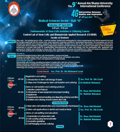 ورشة عمل اونلاين في أساسيات عزل و استزراع الخلايا الجذعية على هامش المؤتمر الدولي السنوي التاسع لجامعة عين شمس - 10 أبريل 2021