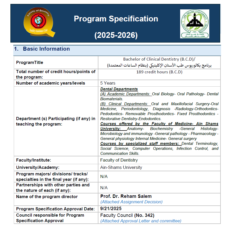 للاطلاع على وثيقة مواصفات برنامج بكالوريوس طب الأسنان الإكلينيكي (B.C.D):