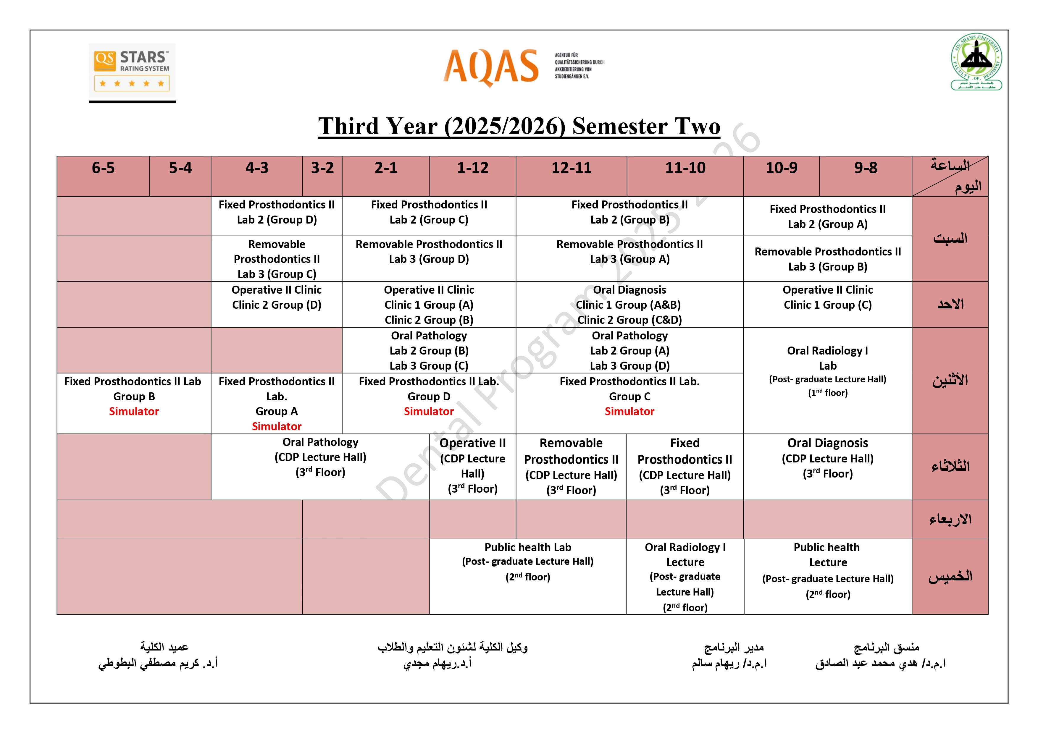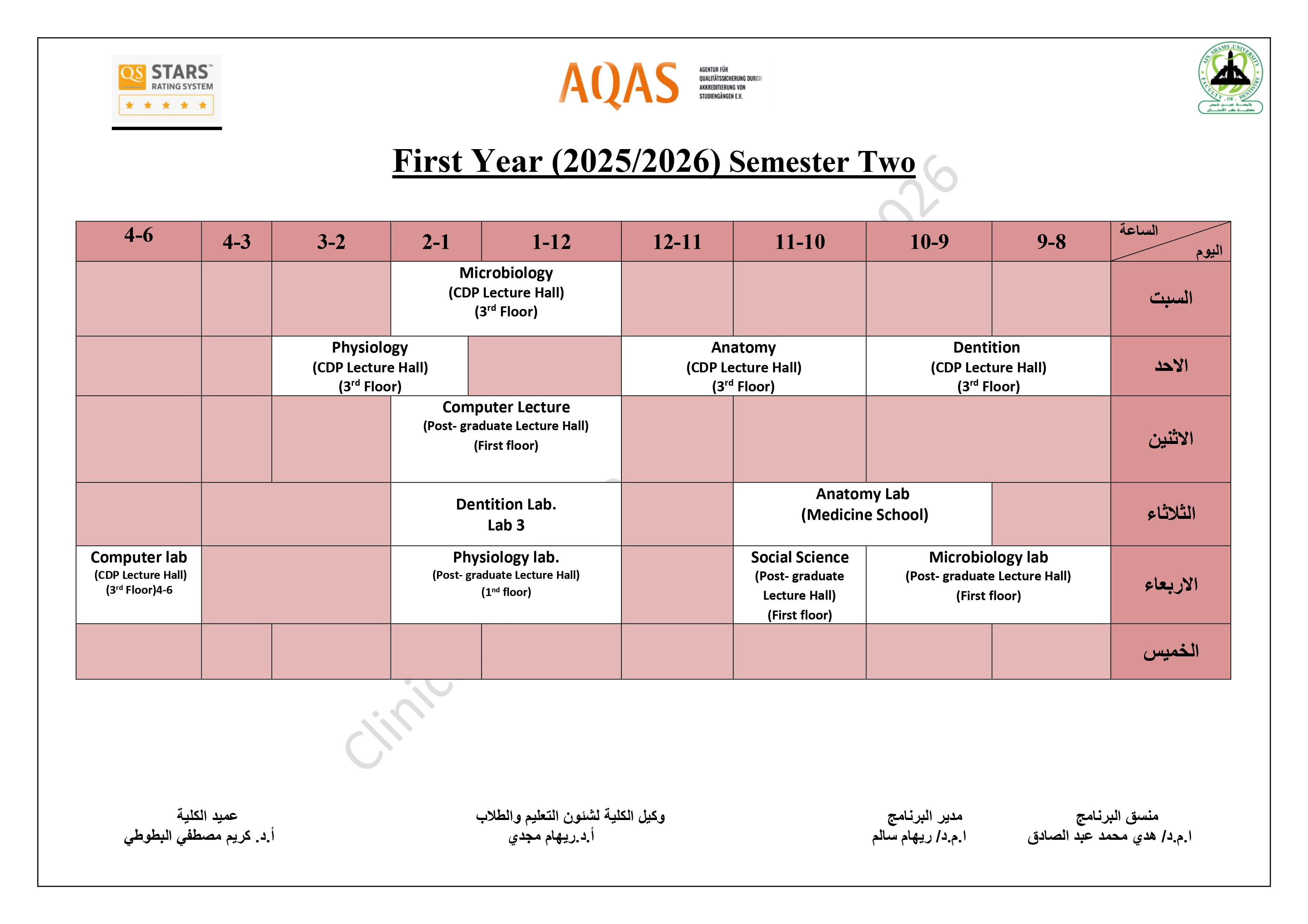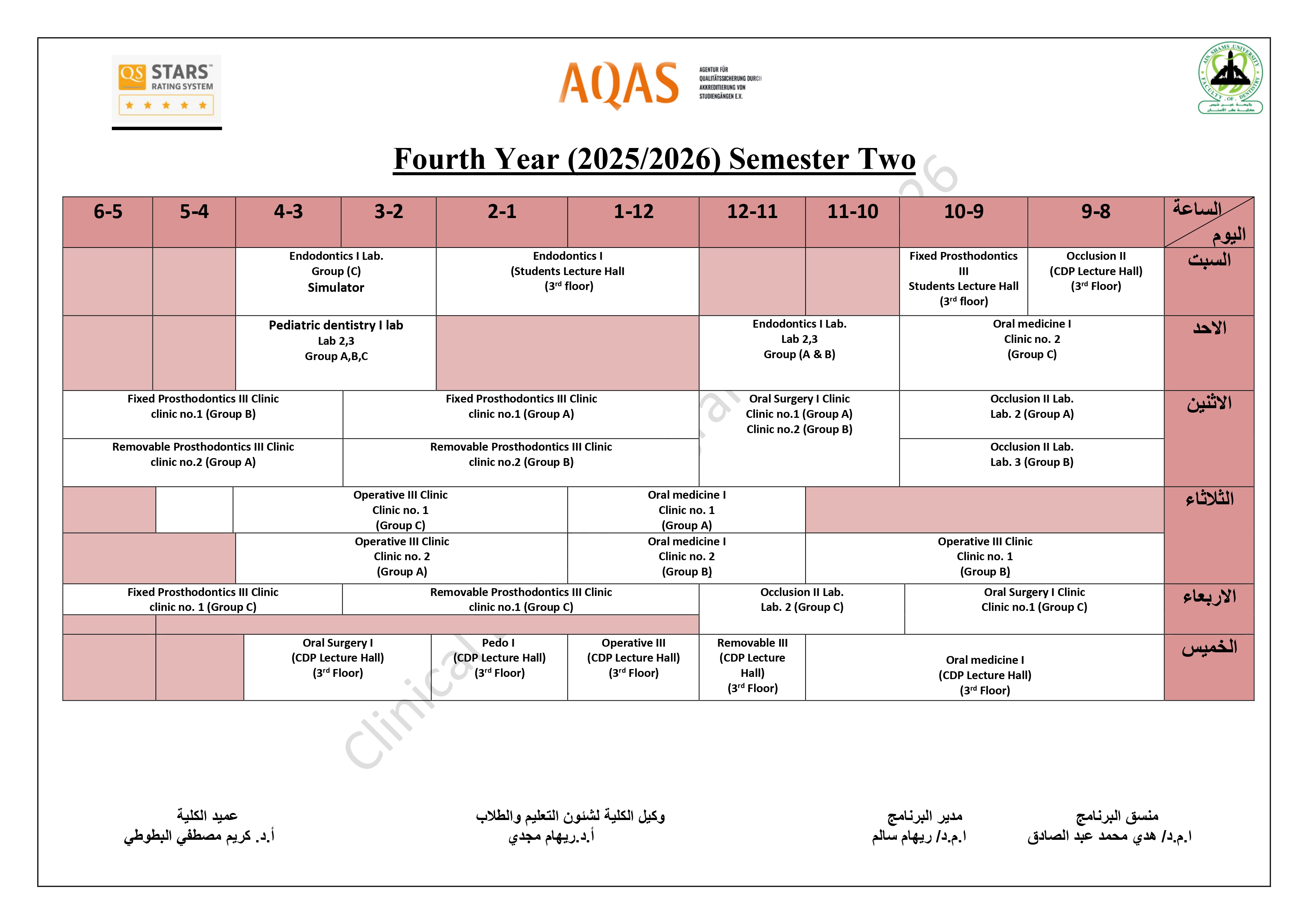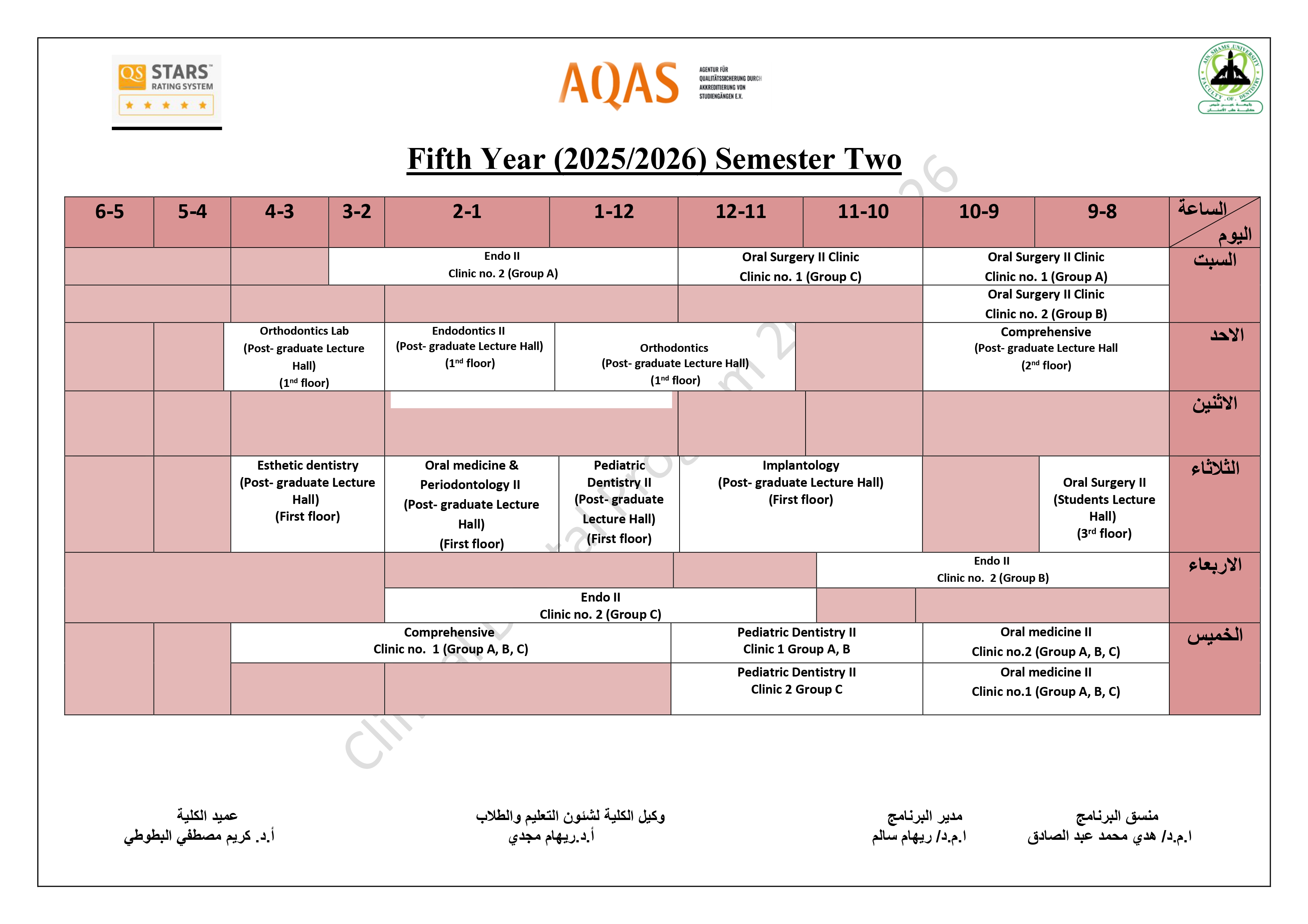 جدول السنة الخامسة للمحاضرات/السكاشن للعام الأكاديمي 2025/2026