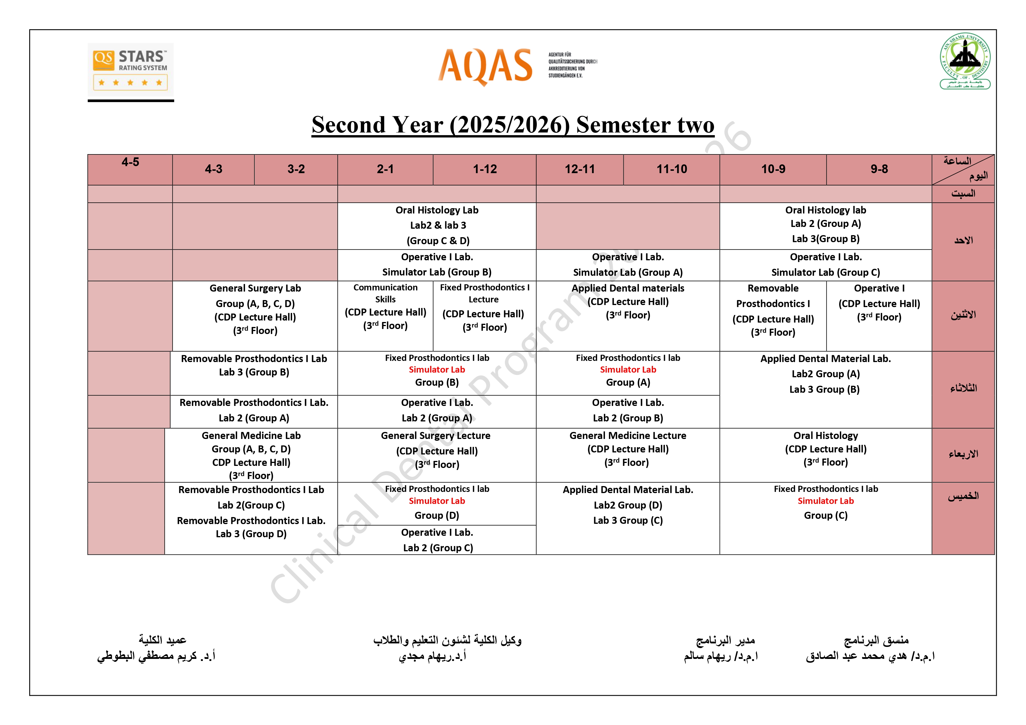 جدول السنة الثانية للمحاضرات/السكاشن للعام الأكاديمي 2025/2026