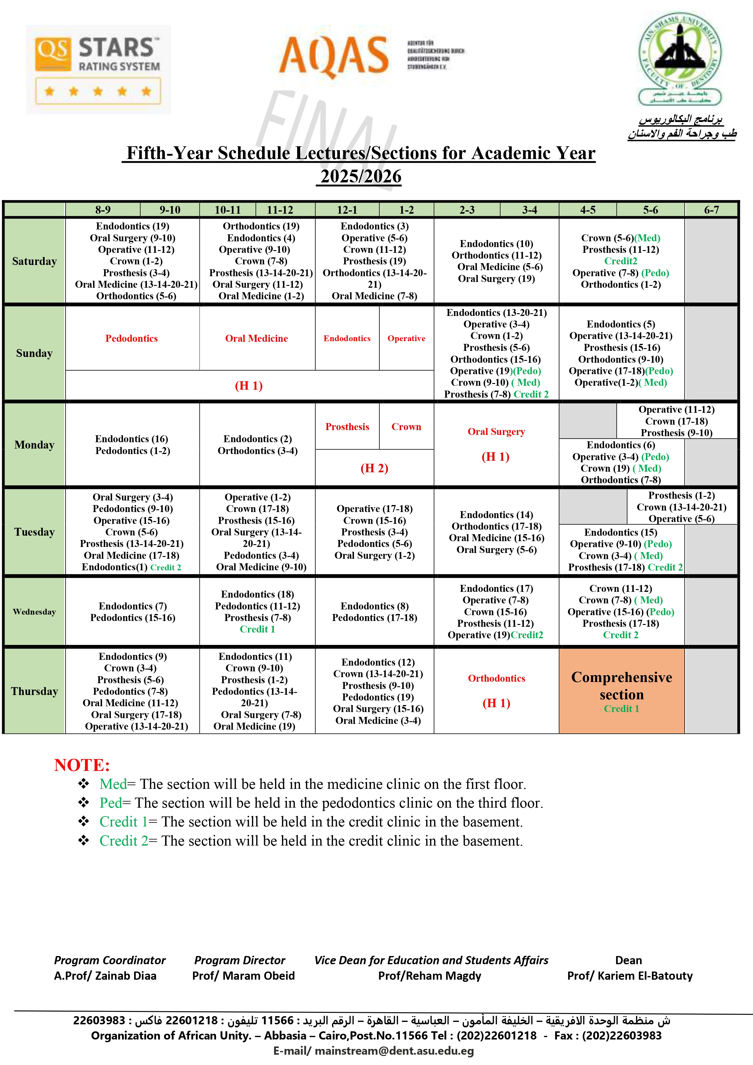 جدول السنة الخامسة للمحاضرات/السكاشن للعام الأكاديمي 2025/2026