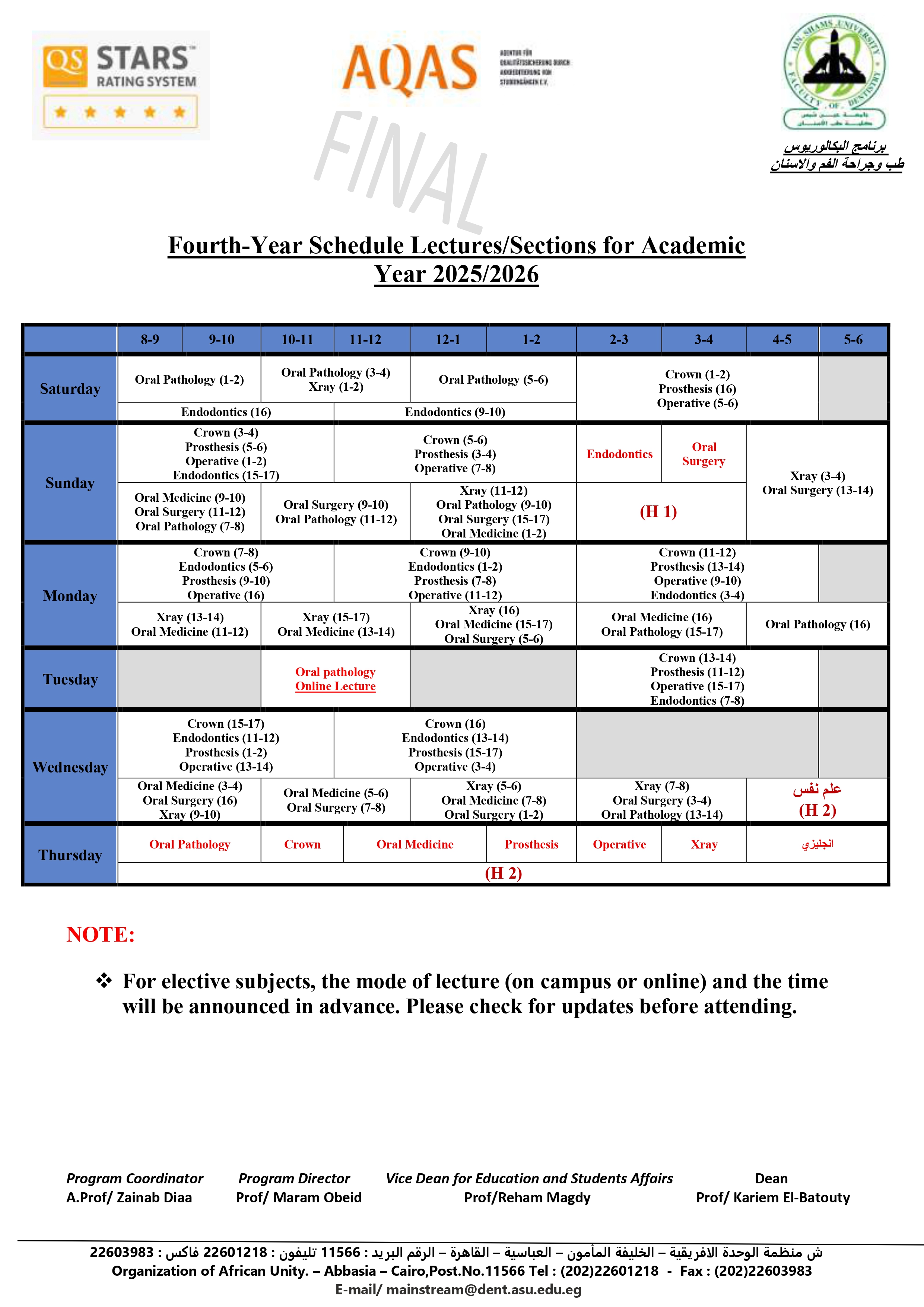 جدول السنة الرابعة للمحاضرات/السكاشن للعام الأكاديمي 2025/2026