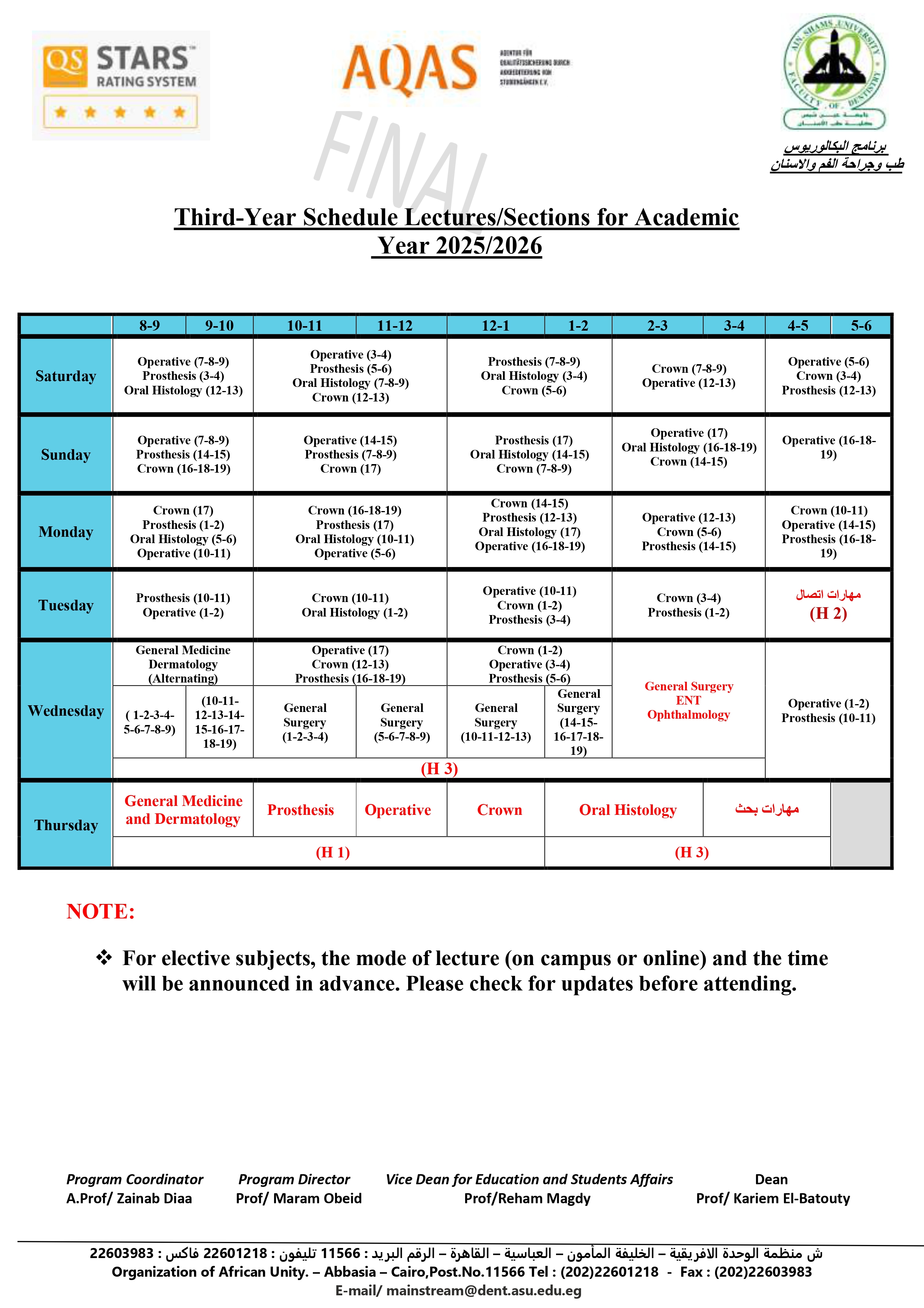 جدول السنة الثالثة للمحاضرات/السكاشن للعام الأكاديمي 2025/2026