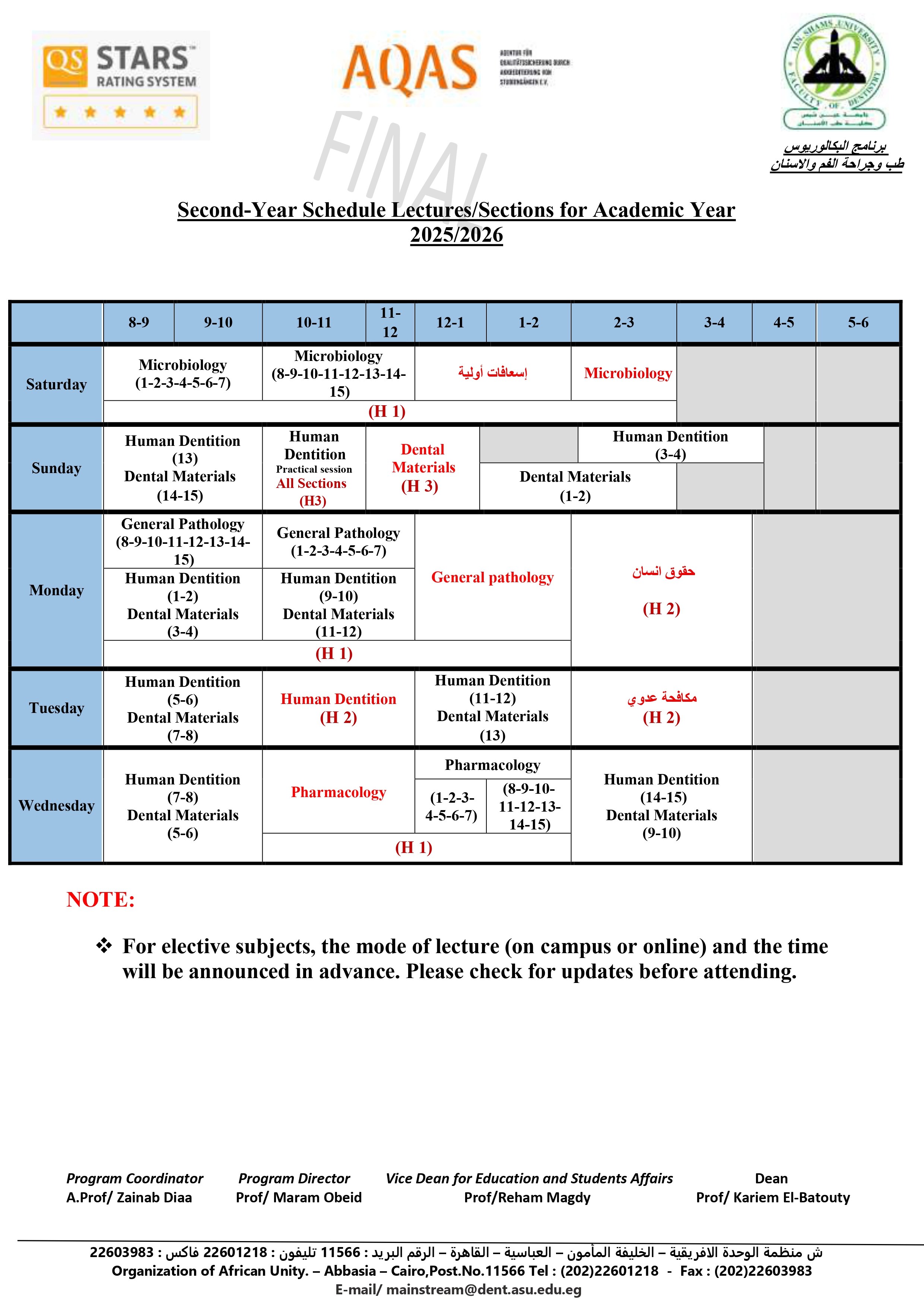 جدول السنة الثانية للمحاضرات/السكاشن للعام الأكاديمي 2025/2026