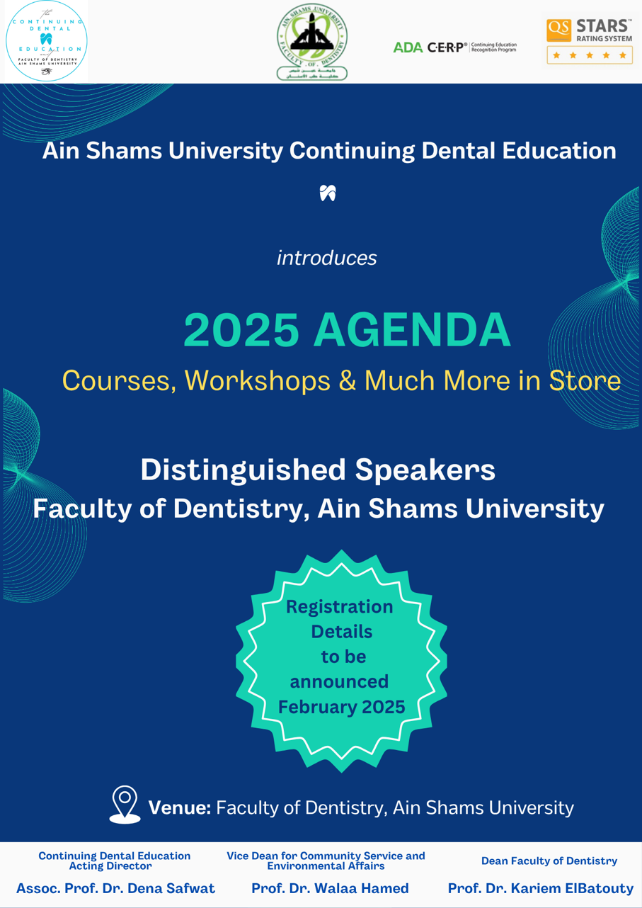 Ain Shams University Continuing Dental Education > 2025 AGENDA Courses, Workshops |