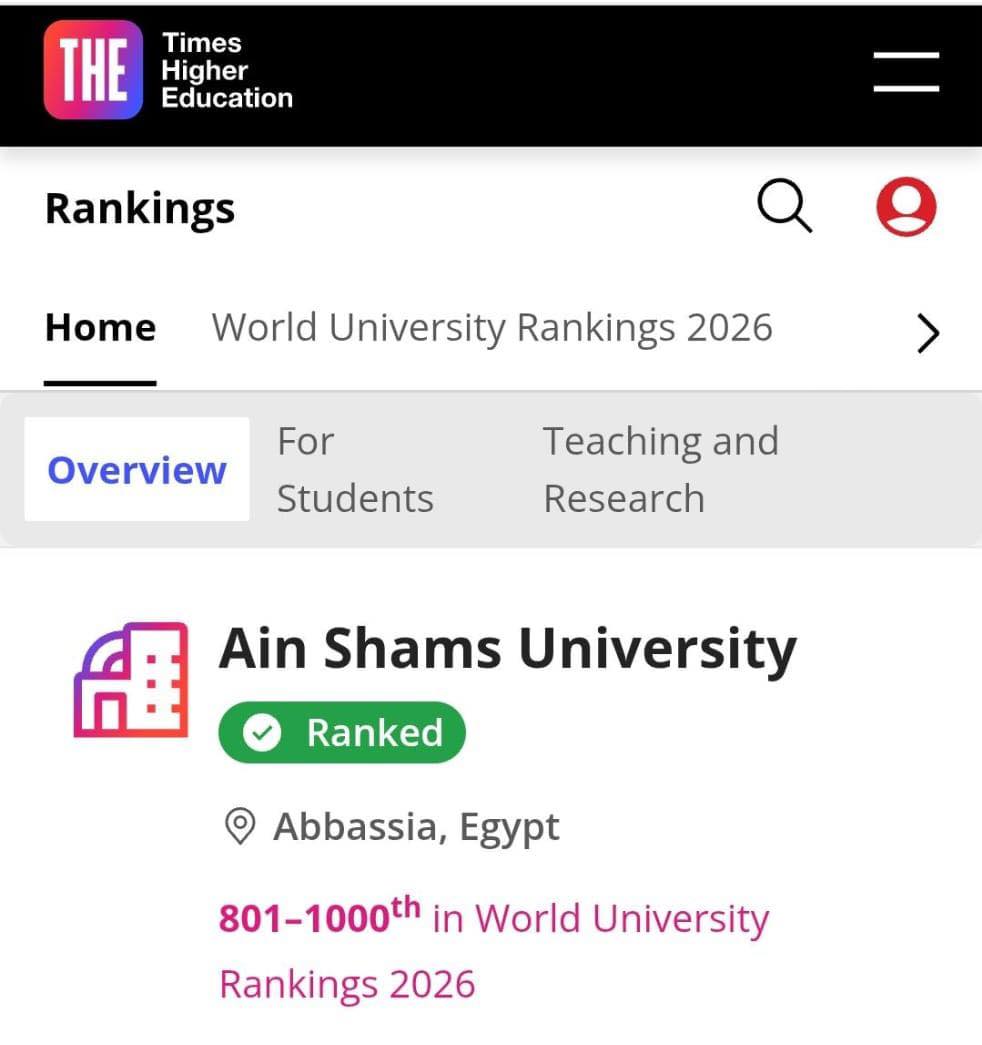 Under the patronage of Prof. Mohamed Diaa Zain El-Abedeen, President of Ain Shams University, the university has made a significant leap in its global ranking. According to the Times Higher Education (THE) World University Rankings for 2026, Ain Shams University advanced by 200 places, moving up an entire band to be ranked within the 801–1000 category, compared to its previous position in the 1001–1200 category last year.