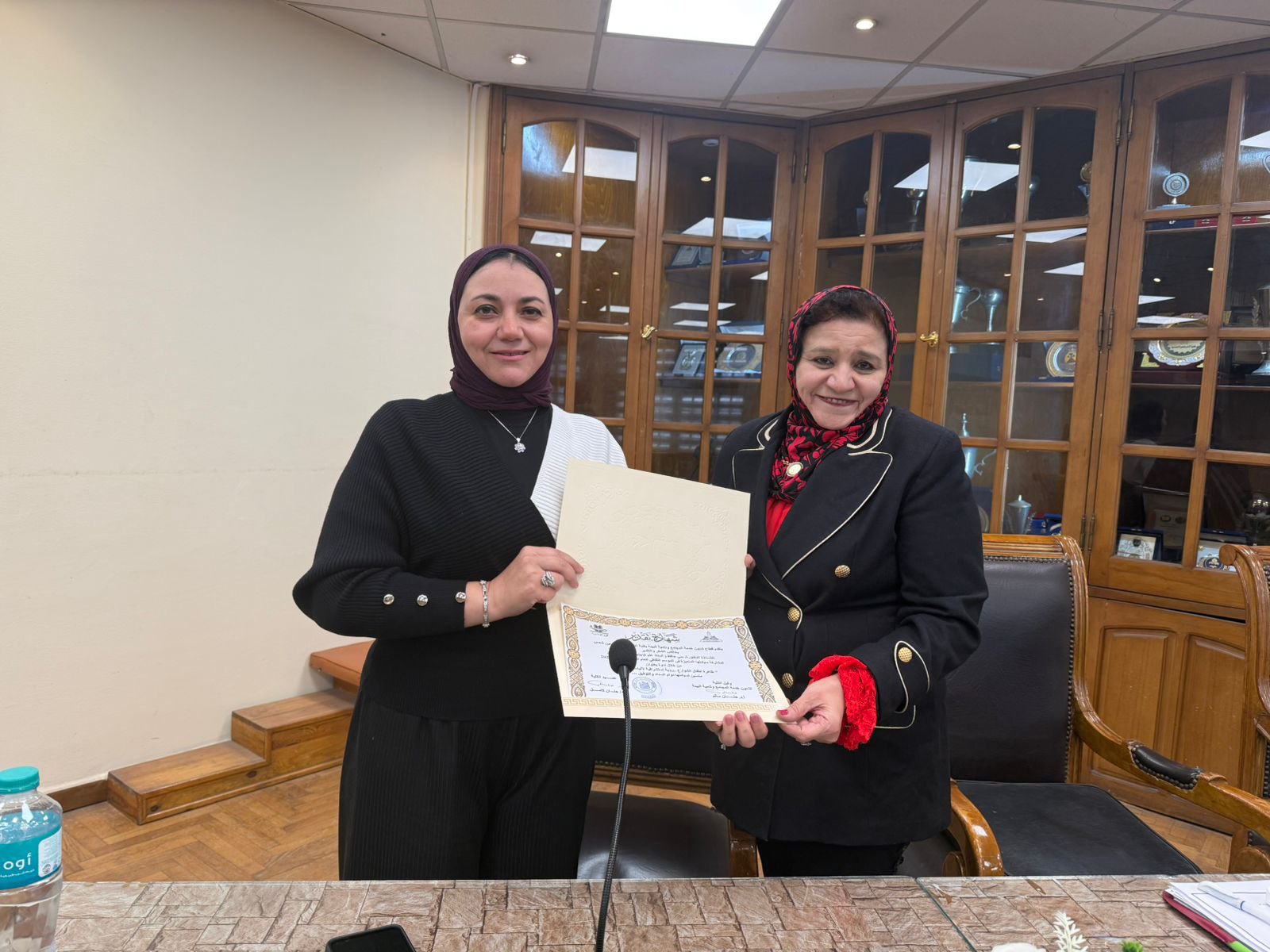 Prof. Hanan Salem, Vice Dean for Community Service and Environmental Development, presented a certificate of appreciation to Prof. Mona Hafez in recognition of her academic contributions and service to the community.