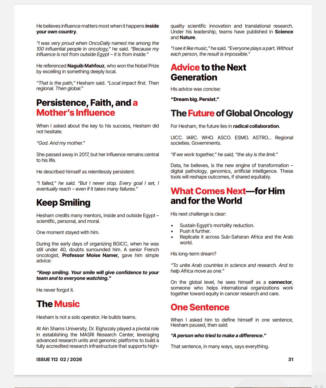 The magazine also highlighted, through its editors' visit to Egypt in January 2026, the concerted efforts of all stakeholders in the fight against cancer in Egypt, their commitment to confronting challenges, capitalizing on all available opportunities, collaborating with all local and international entities, and their success in achieving promising results by all measures.
