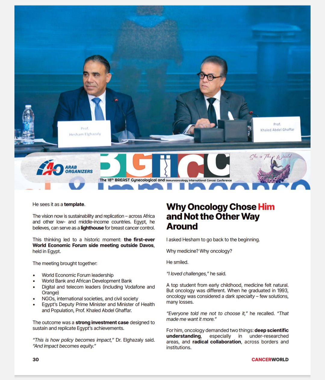 The magazine also praised the transformation of the BGICC conference, under the leadership of Dr. Hisham El-Ghazaly, President of the Egyptian Society of Oncology and Chairman of the Scientific Committee of the Presidential Initiative for Women's Health, from its initial focus on breast cancer, gynecological cancers, and immunotherapy, into one of the largest oncology summits in the region, following the convergence of three major platforms: