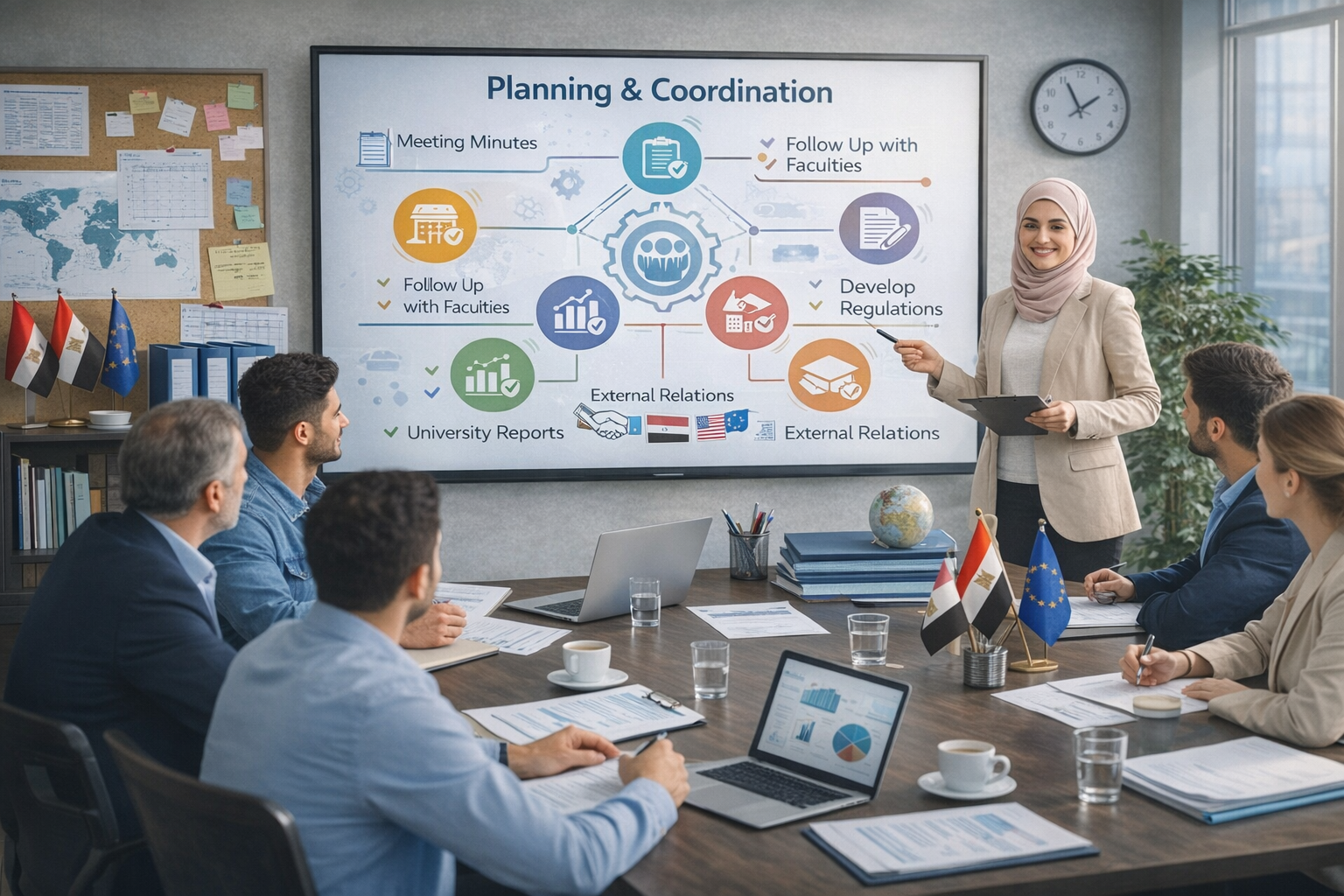 Determine the procedures to be followed when preparing minutes for the relevant committees and councils, or following up the faculties and institutes in implementing the decisions of the committees and councils, or creating and amending internal regulations for higher studies or preparing statistical data and carrying out all work on public topics in terms of the university’s relationship with faculties and institutes or the university’s relationship with external bodies such as other embassies, consulates and universities.